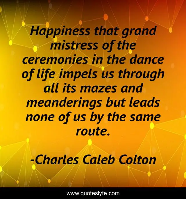 This page presents the quote "Happiness that grand mistress of the ceremonies in the dance of life impels us through all its mazes and meanderings but leads none of us by the same route.". Author of this quote is Charles Caleb Colton. .