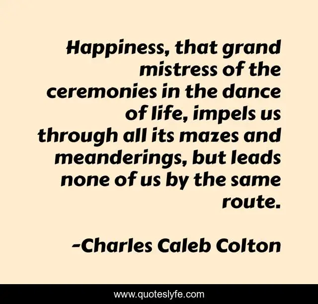 This page presents the quote "Happiness, that grand mistress of the ceremonies in the dance of life, impels us through all its mazes and meanderings, but leads none of us by the same route.". Author of this quote is Charles Caleb Colton. This quote is about dance, life, mistress,.