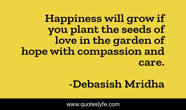 This page presents the quote "Happiness will grow if you plant the seeds of love in the garden of hope with compassion and care.". Author of this quote is Debasish Mridha. This quote is about care, life, love, garden, compassion, intelligence, philosophy, wisdom, inspirational,.