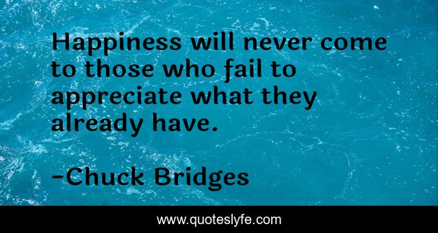 This page presents the quote "Happiness will never come to those who fail to appreciate what they already have.". Author of this quote is Chuck Bridges. This quote is about appreciate, happiness,.