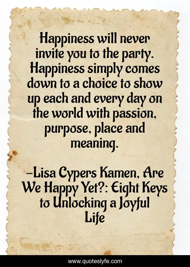 This page presents the quote "Happiness will never invite you to the party. Happiness simply comes down to a choice to show up each and every day on the world with passion, purpose, place and meaning.". Author of this quote is Lisa Cypers Kamen, Are We Happy Yet?: Eight Keys to Unlocking a Joyful Life. This quote is about meaningful-life, choice, meaning, passion, choices-and-consequences, happiness,.