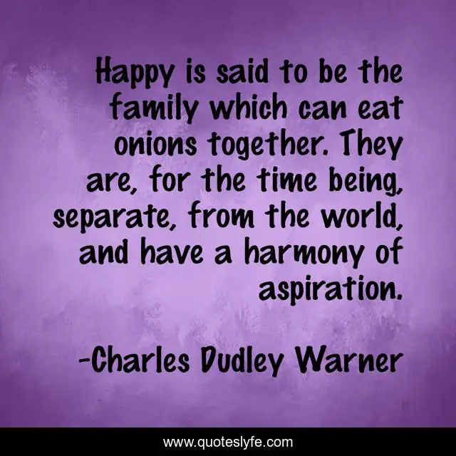 This page presents the quote "Happy is said to be the family which can eat onions together. They are, for the time being, separate, from the world, and have a harmony of aspiration.". Author of this quote is Charles Dudley Warner. This quote is about time, together, happy,.