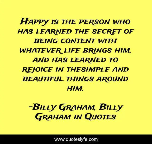 This page presents the quote "Happy is the person who has learned the secret of being content with whatever life brings him, and has learned to rejoice in thesimple and beautiful things around him.". Author of this quote is Billy Graham, Billy Graham in Quotes. This quote is about happiness, billy-graham,.