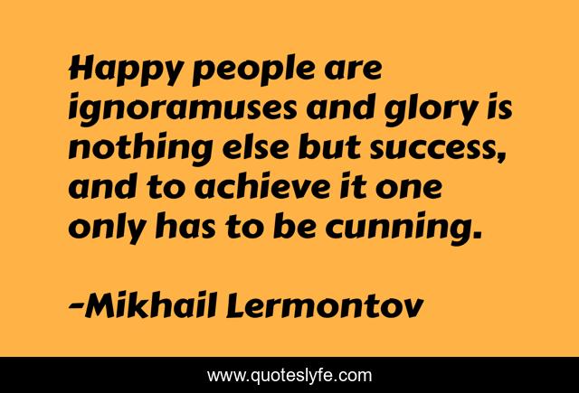 This page presents the quote "Happy people are ignoramuses and glory is nothing else but success, and to achieve it one only has to be cunning.". Author of this quote is Mikhail Lermontov. This quote is about happy, achieve, people,.