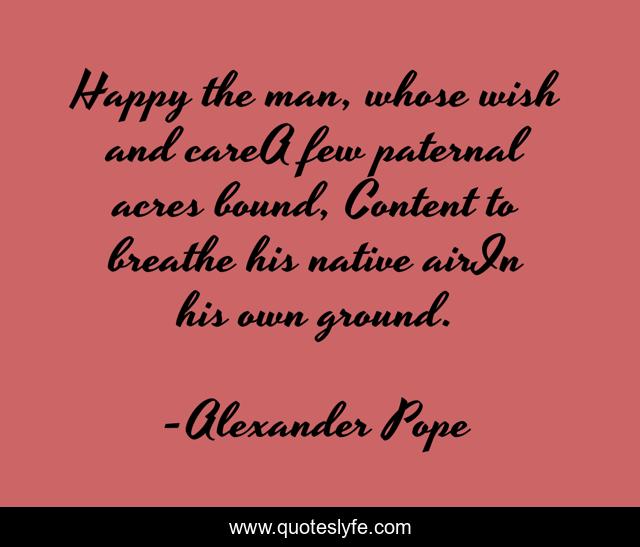 This page presents the quote "Happy the man, whose wish and careA few paternal acres bound, Content to breathe his native airIn his own ground.". Author of this quote is Alexander Pope. This quote is about contentment, not-my-life, land, dream, home,.