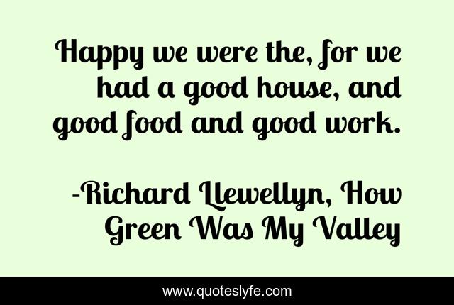 This page presents the quote "Happy we were the, for we had a good house, and good food and good work.". Author of this quote is Richard Llewellyn, How Green Was My Valley. This quote is about food, house, work, happiness,.