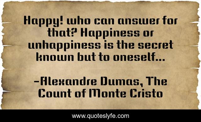 This page presents the quote "Happy! who can answer for that? Happiness or unhappiness is the secret known but to oneself…". Author of this quote is Alexandre Dumas, The Count of Monte Cristo. This quote is about secret, happiness, happy,.
