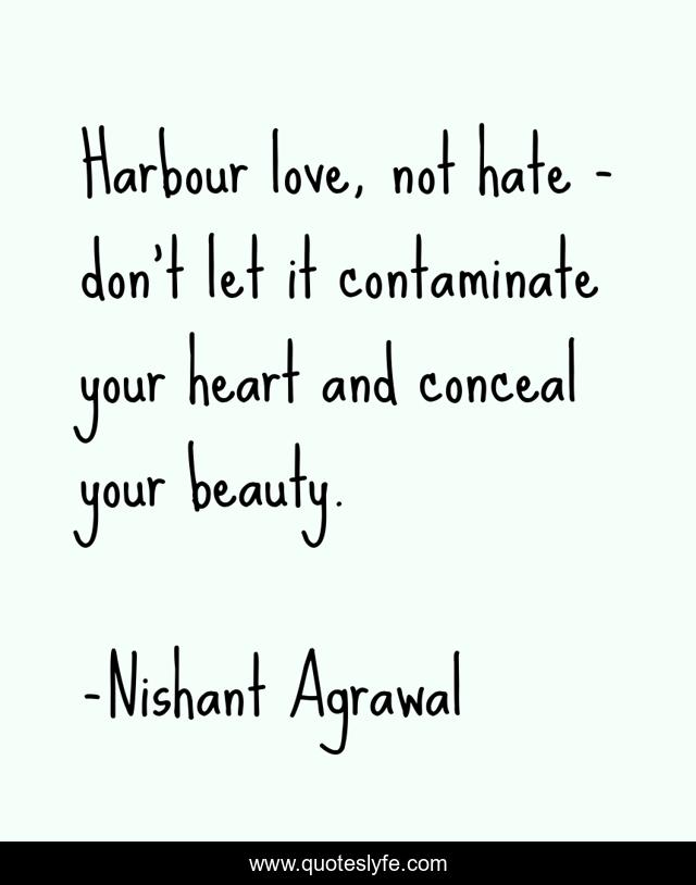 This page presents the quote "Harbour love, not hate - don't let it contaminate your heart and conceal your beauty.". Author of this quote is Nishant Agrawal. .