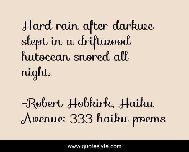 This page presents the quote "Hard rain after darkwe slept in a driftwood hutocean snored all night.". Author of this quote is Robert Hobkirk, Haiku Avenue: 333 haiku poems. .