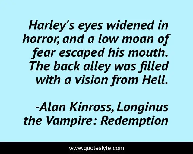 This page presents the quote "Harley's eyes widened in horror, and a low moan of fear escaped his mouth. The back alley was filled with a vision from Hell.". Author of this quote is Alan Kinross, Longinus the Vampire: Redemption. This quote is about hell, fear, horror, demons, vampires,.