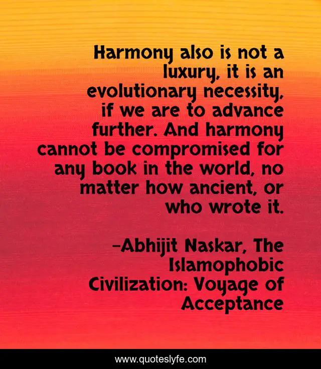 This page presents the quote "Harmony also is not a luxury, it is an evolutionary necessity, if we are to advance further. And harmony cannot be compromised for any book in the world, no matter how ancient, or who wrote it.". Author of this quote is Abhijit Naskar, The Islamophobic Civilization: Voyage of Acceptance. This quote is about confidence, brainy, thinkers, inspirational, religious-extremism, wise-sayings, motivational, optimistic, words-of-wisdom,.