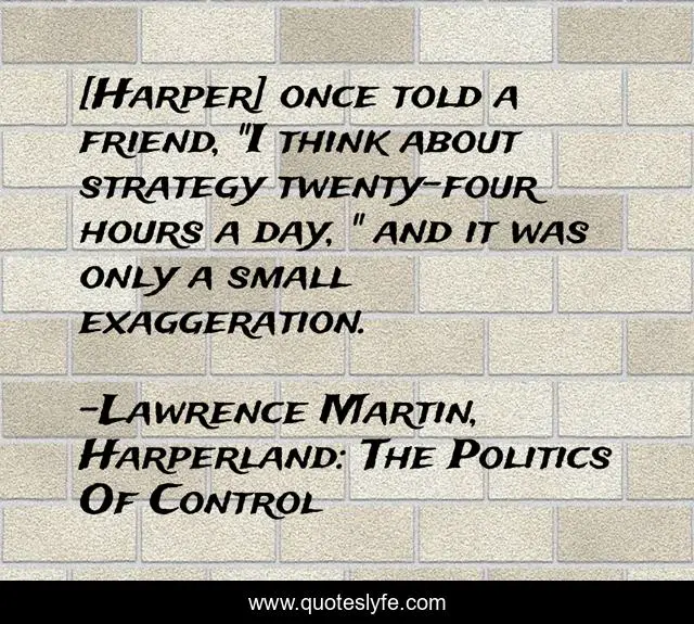 This page presents the quote "[Harper] once told a friend, "I think about strategy twenty-four hours a day, " and it was only a small exaggeration.". Author of this quote is Lawrence Martin, Harperland: The Politics Of Control. This quote is about canadian-politics, stephen-harper, strategy,.