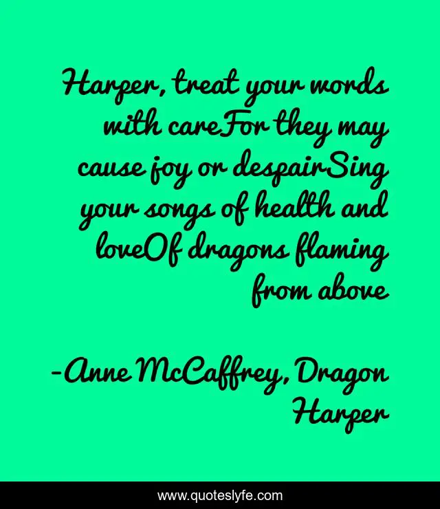 This page presents the quote "Harper, treat your words with careFor they may cause joy or despairSing your songs of health and loveOf dragons flaming from above". Author of this quote is Anne McCaffrey, Dragon Harper. .