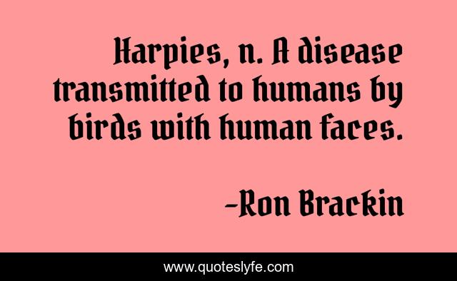 This page presents the quote "Harpies, n. A disease transmitted to humans by birds with human faces.". Author of this quote is Ron Brackin. This quote is about std, harpies, herpes, mythology,.