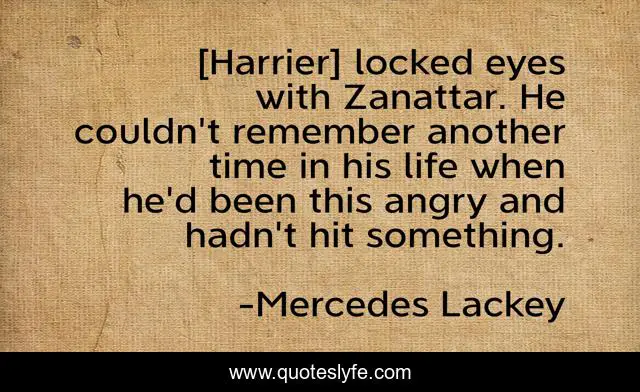 This page presents the quote "[Harrier] locked eyes with Zanattar. He couldn't remember another time in his life when he'd been this angry and hadn't hit something.". Author of this quote is Mercedes Lackey. This quote is about anger, humor,.