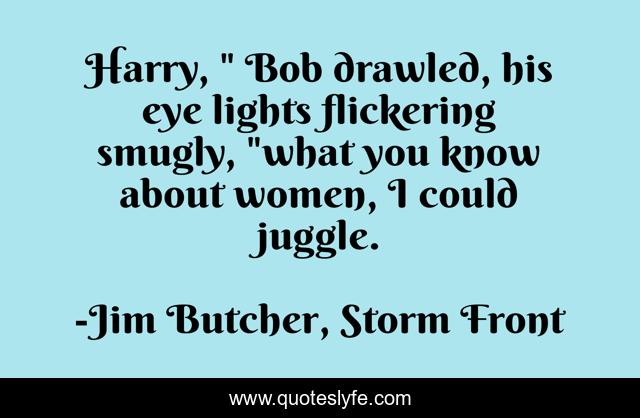 This page presents the quote "Harry, " Bob drawled, his eye lights flickering smugly, "what you know about women, I could juggle.". Author of this quote is Jim Butcher, Storm Front. This quote is about humor, women,.