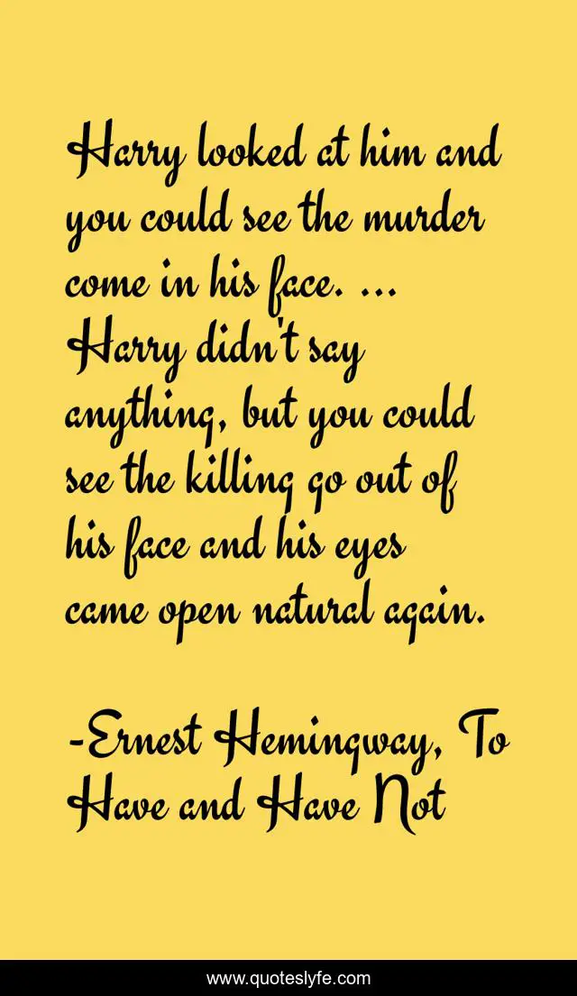 This page presents the quote "Harry looked at him and you could see the murder come in his face. ... Harry didn't say anything, but you could see the killing go out of his face and his eyes came open natural again.". Author of this quote is Ernest Hemingway, To Have and Have Not. This quote is about face, murder, expression, killing,.