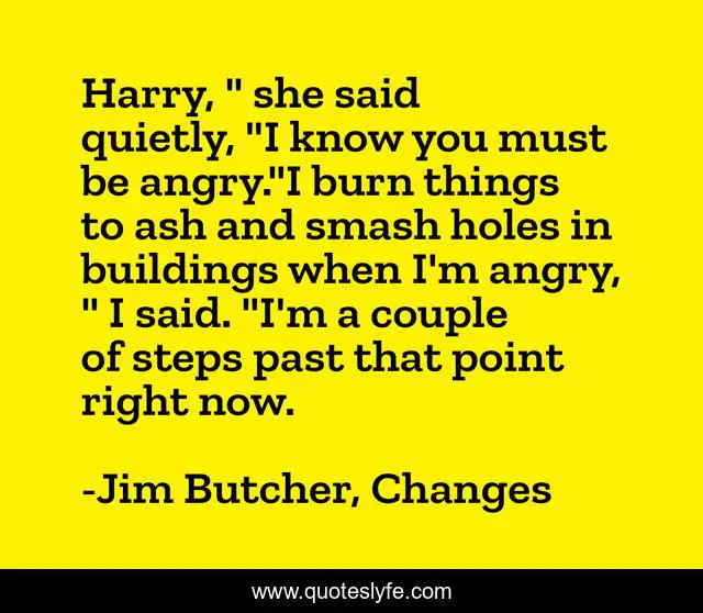 This page presents the quote "Harry, " she said quietly, "I know you must be angry."I burn things to ash and smash holes in buildings when I'm angry, " I said. "I'm a couple of steps past that point right now.". Author of this quote is Jim Butcher, Changes. This quote is about anger, harry-dresden,.