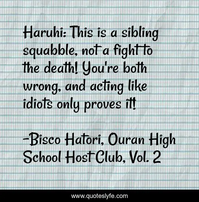 This page presents the quote "Haruhi: This is a sibling squabble, not a fight to the death! You're both wrong, and acting like idiots only proves it!". Author of this quote is Bisco Hatori, Ouran High School Host Club, Vol. 2. This quote is about siblings, idiots, twins, fight,.