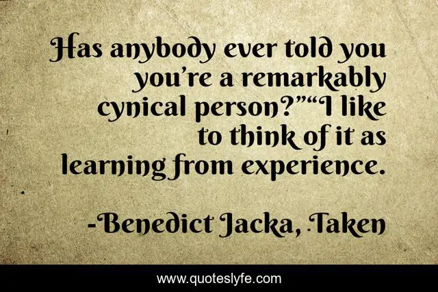 This page presents the quote "Has anybody ever told you you’re a remarkably cynical person?”“I like to think of it as learning from experience.". Author of this quote is Benedict Jacka, Taken. This quote is about funny, cynical, cynical-humor, benedict-jacka, alex-verus, cynicism, comedy,.
