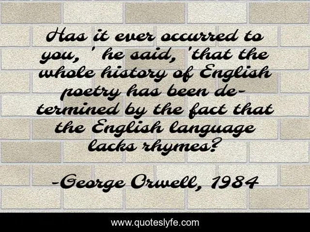 This page presents the quote "Has it ever occurred to you, ' he said, 'that the whole history of English poetry has been de-termined by the fact that the English language lacks rhymes?". Author of this quote is George Orwell, 1984. .