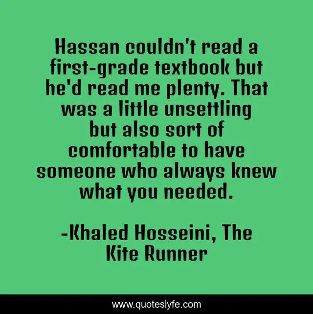 This page presents the quote "Hassan couldn't read a first-grade textbook but he'd read me plenty. That was a little unsettling but also sort of comfortable to have someone who always knew what you needed.". Author of this quote is Khaled Hosseini, The Kite Runner. This quote is about enthusiasm, friendship, inspirational,.