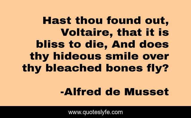 This page presents the quote "Hast thou found out, Voltaire, that it is bliss to die, And does thy hideous smile over thy bleached bones fly?". Author of this quote is Alfred de Musset. This quote is about bliss, death, voltaire,.