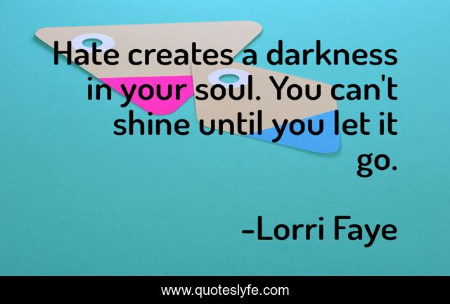 This page presents the quote "Hate creates a darkness in your soul. You can't shine until you let it go.". Author of this quote is Lorri Faye. This quote is about shine, enthusiasm, hate, inspirational,.