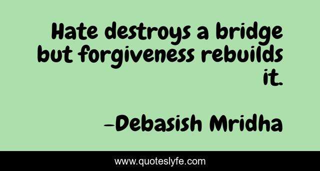This page presents the quote "Hate destroys a bridge but forgiveness rebuilds it.". Author of this quote is Debasish Mridha. This quote is about bridge, debasish, forgiveness-rebuilds, mridha, philosophy, debasish-mridha, hate-destroys, forgiveness, hate,.