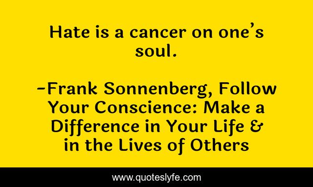 "Frank Sonnenberg, Follow Your Conscience: Make a Difference in Your Life & in the Lives of Others Quotes." Quoteslyfe.com, 2025. Sat. 06 Dec. 2025. <https://www.quoteslyfe.com/quote/Hate-is-a-cancer-on-one-s-163415>.