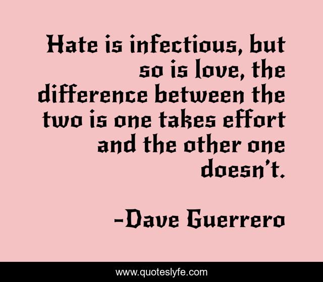 This page presents the quote "Hate is infectious, but so is love, the difference between the two is one takes effort and the other one doesn’t.". Author of this quote is Dave Guerrero. This quote is about living, life, love, change, hate, affection,.