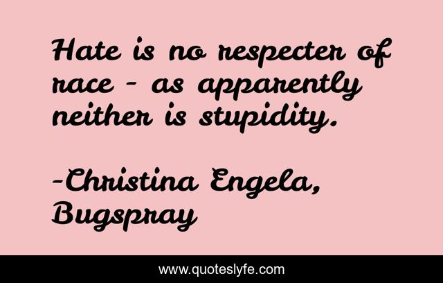 This page presents the quote "Hate is no respecter of race - as apparently neither is stupidity.". Author of this quote is Christina Engela, Bugspray. This quote is about apparently, stupidity, race, hate, respecter,.