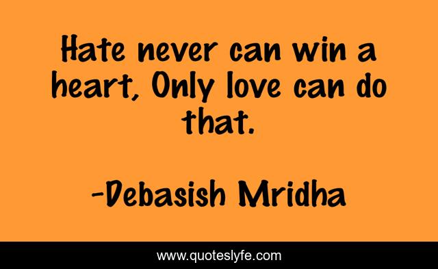 This page presents the quote "Hate never can win a heart, Only love can do that.". Author of this quote is Debasish Mridha. This quote is about heart, life, love, beauty, win, philosophy, truth, hate, affection,.