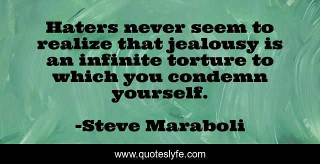 This page presents the quote "Haters never seem to realize that jealousy is an infinite torture to which you condemn yourself.". Author of this quote is Steve Maraboli. This quote is about haters, jealousy,.