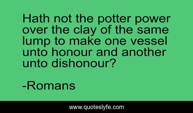 This page presents the quote "Hath not the potter power over the clay of the same lump to make one vessel unto honour and another unto dishonour?". Author of this quote is Romans. .