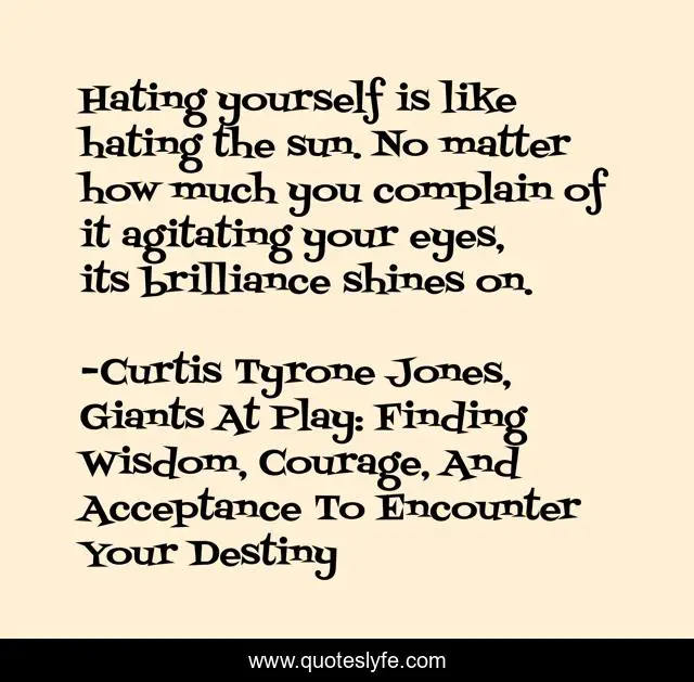 "Curtis Tyrone Jones, Giants At Play: Finding Wisdom, Courage, And Acceptance To Encounter Your Destiny Quotes." Quoteslyfe.com, 2025. Fri. 05 Dec. 2025. <https://www.quoteslyfe.com/quote/Hating-yourself-is-like-hating-the-sun-77780>.