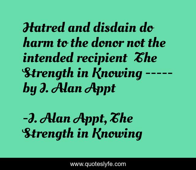 This page presents the quote "Hatred and disdain do harm to the donor not the intended recipient…The Strength in Knowing ----- by I. Alan Appt". Author of this quote is I. Alan Appt, The Strength in Knowing. This quote is about enthusiasm, philosophical, psychology, inspirational, self-help,.