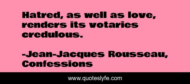 This page presents the quote "Hatred, as well as love, renders its votaries credulous.". Author of this quote is Jean-Jacques Rousseau, Confessions. This quote is about gullibility, hatred, love, affection,.