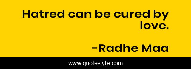 This page presents the quote "Hatred can be cured by love.". Author of this quote is Radhe Maa. This quote is about spiritual, radhe-guru-maa, spiritual-leader, radhe-maa, spiritual-sayings, wisdom, quotes-and-saying, inner-peace, spiritual-insights,.