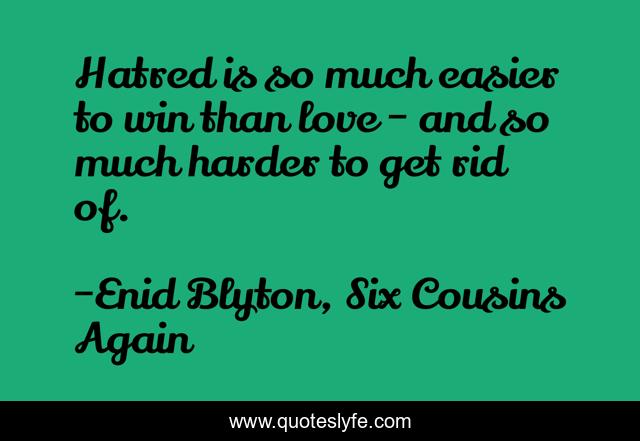 This page presents the quote "Hatred is so much easier to win than love - and so much harder to get rid of.". Author of this quote is Enid Blyton, Six Cousins Again. This quote is about hatred, love, affection,.