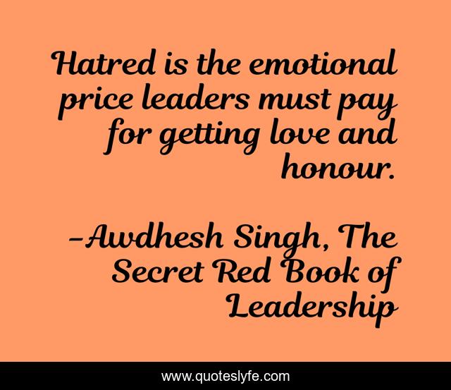 This page presents the quote "Hatred is the emotional price leaders must pay for getting love and honour.". Author of this quote is Awdhesh Singh, The Secret Red Book of Leadership. This quote is about hatred, leadership, love, leaders, affection,.