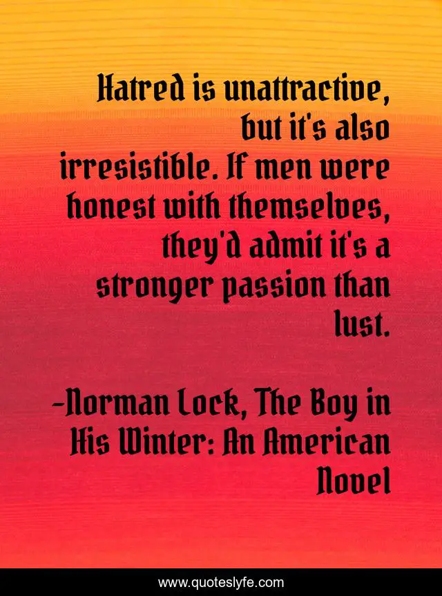 This page presents the quote "Hatred is unattractive, but it's also irresistible. If men were honest with themselves, they'd admit it's a stronger passion than lust.". Author of this quote is Norman Lock, The Boy in His Winter: An American Novel. This quote is about human-nature, huck-finn, lust, human-passion, hate, literary-character-appropriation,.