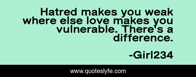 This page presents the quote "Hatred makes you weak where else love makes you vulnerable. There's a difference.". Author of this quote is Girl234. This quote is about love, weakness, vulnerability, weak, vulnerable, hatred, affection,.