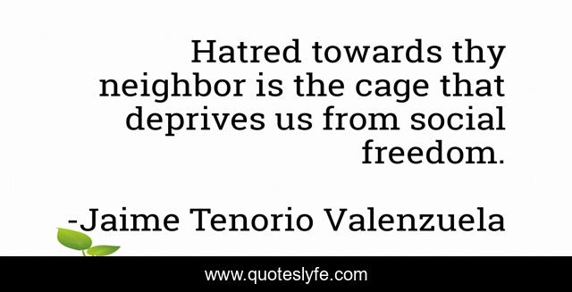 This page presents the quote "Hatred towards thy neighbor is the cage that deprives us from social freedom.". Author of this quote is Jaime Tenorio Valenzuela. This quote is about freedom, hatred, nightbor, cage, social,.