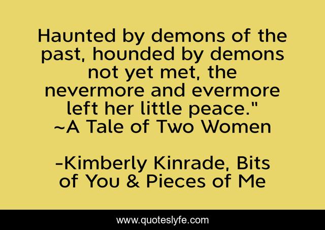 This page presents the quote "Haunted by demons of the past, hounded by demons not yet met, the nevermore and evermore left her little peace.” ~A Tale of Two Women". Author of this quote is Kimberly Kinrade, Bits of You & Pieces of Me. This quote is about enthusiasm, memoir, inspirational, poetry,.