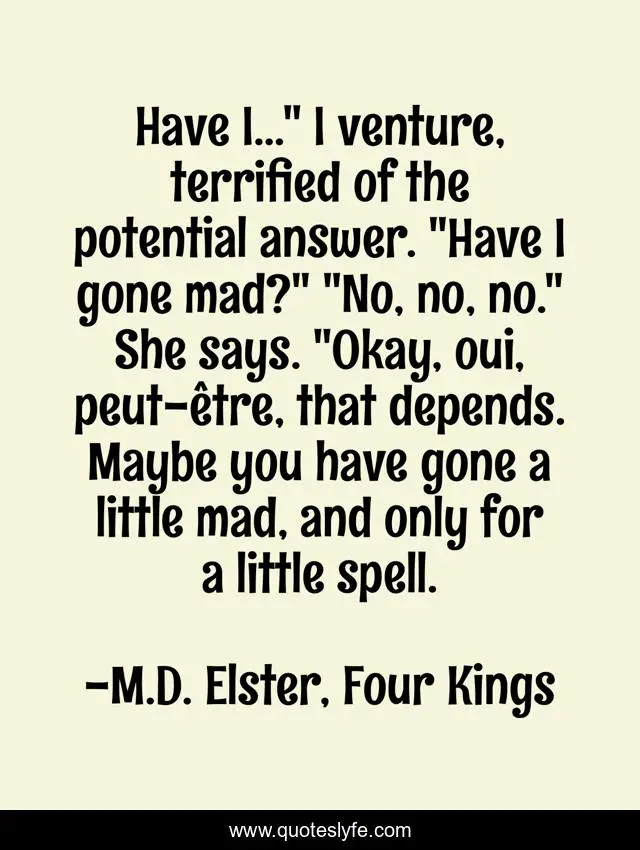 This page presents the quote "Have I..." I venture, terrified of the potential answer. "Have I gone mad?" "No, no, no." She says. "Okay, oui, peut-être, that depends. Maybe you have gone a little mad, and only for a little spell.". Author of this quote is M.D. Elster, Four Kings. This quote is about crazy, retellings, madness, craziness, hospital, retelling, alice, french, insanity,.