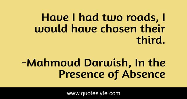 This page presents the quote "Have I had two roads, I would have chosen their third.". Author of this quote is Mahmoud Darwish, In the Presence of Absence. This quote is about mahmoud-darwish, philosophy-of-life, poetry,.