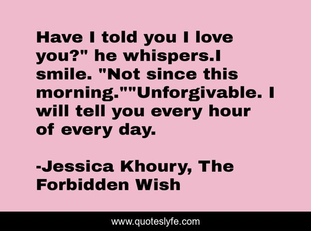 This page presents the quote "Have I told you I love you?" he whispers.I smile. "Not since this morning.""Unforgivable. I will tell you every hour of every day.". Author of this quote is Jessica Khoury, The Forbidden Wish. This quote is about cute, zahra, humor, aladdin, the-forbidden-wish,.