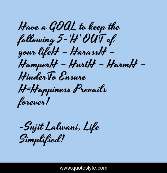 This page presents the quote "Have a GOAL to keep the following 5-‘H’ OUT of your lifeH – HarassH – HamperH – HurtH – HarmH – HinderTo Ensure H=Happiness Prevails forever!". Author of this quote is Sujit Lalwani, Life Simplified!. This quote is about life, inspirational, motivation, life-lessons, enthusiasm, happiness,.