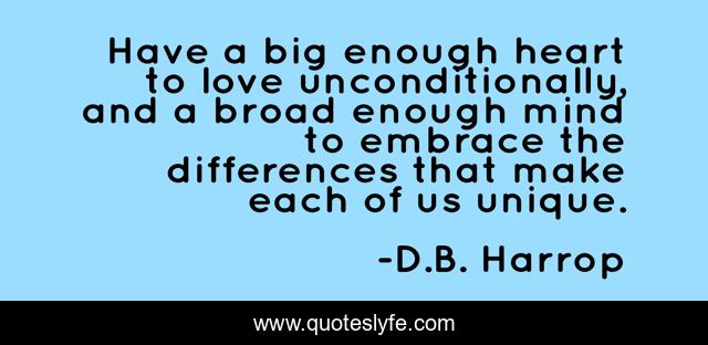 This page presents the quote "Have a big enough heart to love unconditionally, and a broad enough mind to embrace the differences that make each of us unique.". Author of this quote is D.B. Harrop. This quote is about respecting-others, love, acceptance, respect-yourself, life-lessons, life-philosophy, affection,.